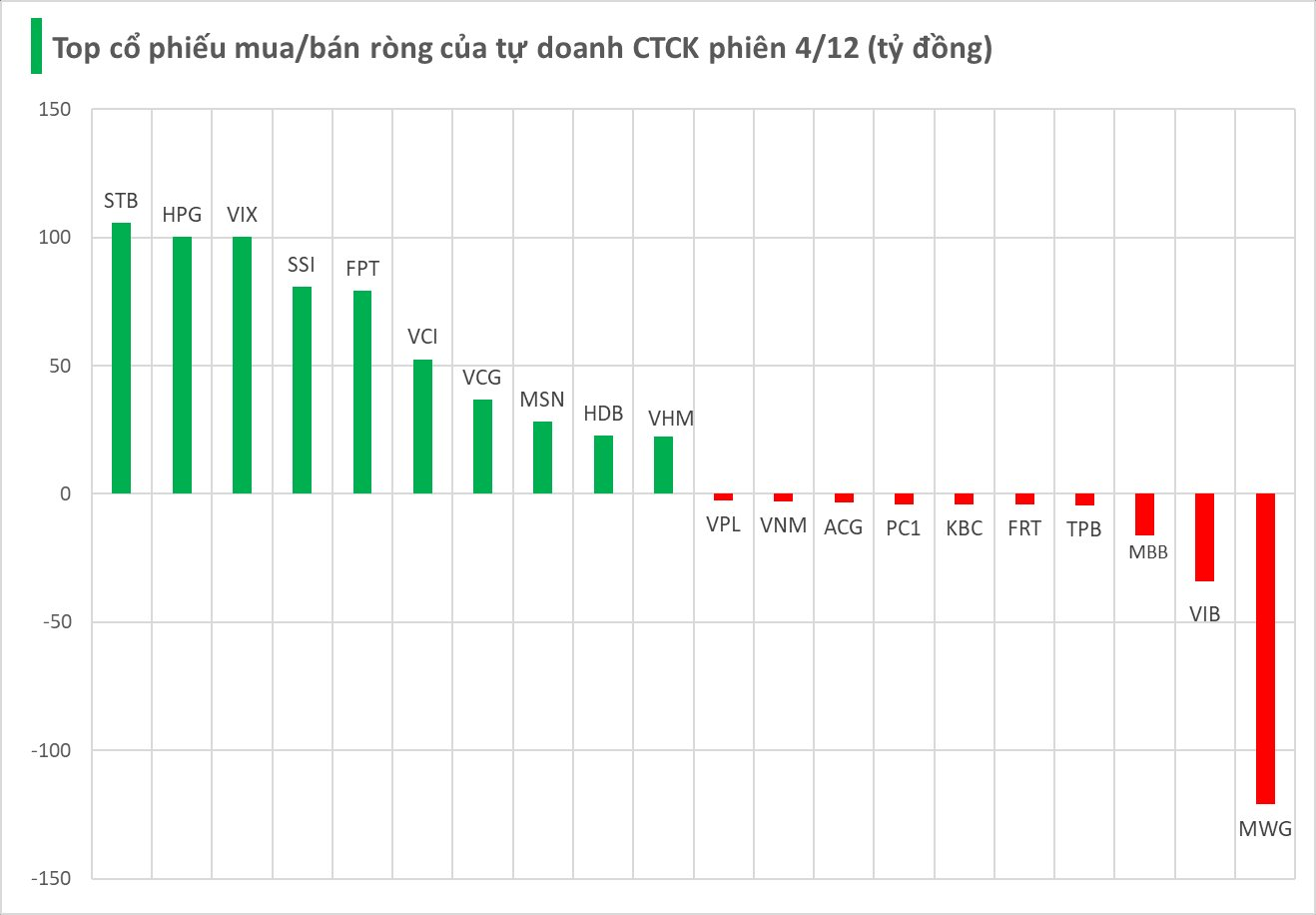 Cụ thể, STB được mua ròng mạnh nhất với giá trị 106 tỷ đồng, theo sau là HPG (100 tỷ), VIX (100 tỷ), SSI (81 tỷ), FPT (79 tỷ), VCI (53 tỷ), VCG (37 tỷ), MSN (28 tỷ), HDB (23 tỷ) và VHM (22 tỷ đồng) – đều nằm trong nhóm được tự doanh CTCK mua ròng tích cực.