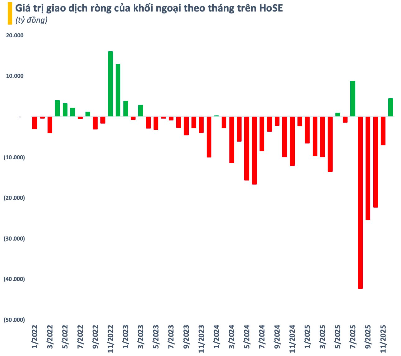 Điểm tích cực là áp lực từ khối ngoại đã giảm đáng kể. Trong tháng 11, khối ngoại bán ròng hơn 6.900 tỷ đồng trên HoSE, mức thấp nhất trong vòng 4 tháng. Trong 3 tháng 8-9-10 trước đó, tổng giá trị bán ròng lên đến gần 90.000 tỷ đồng. Có thể thấy dòng tiền ngoại đang có dấu hiệu đảo chiều khi đang mua ròng khoảng 4.400 tỷ đồng từ đầu tháng 12 đến nay.