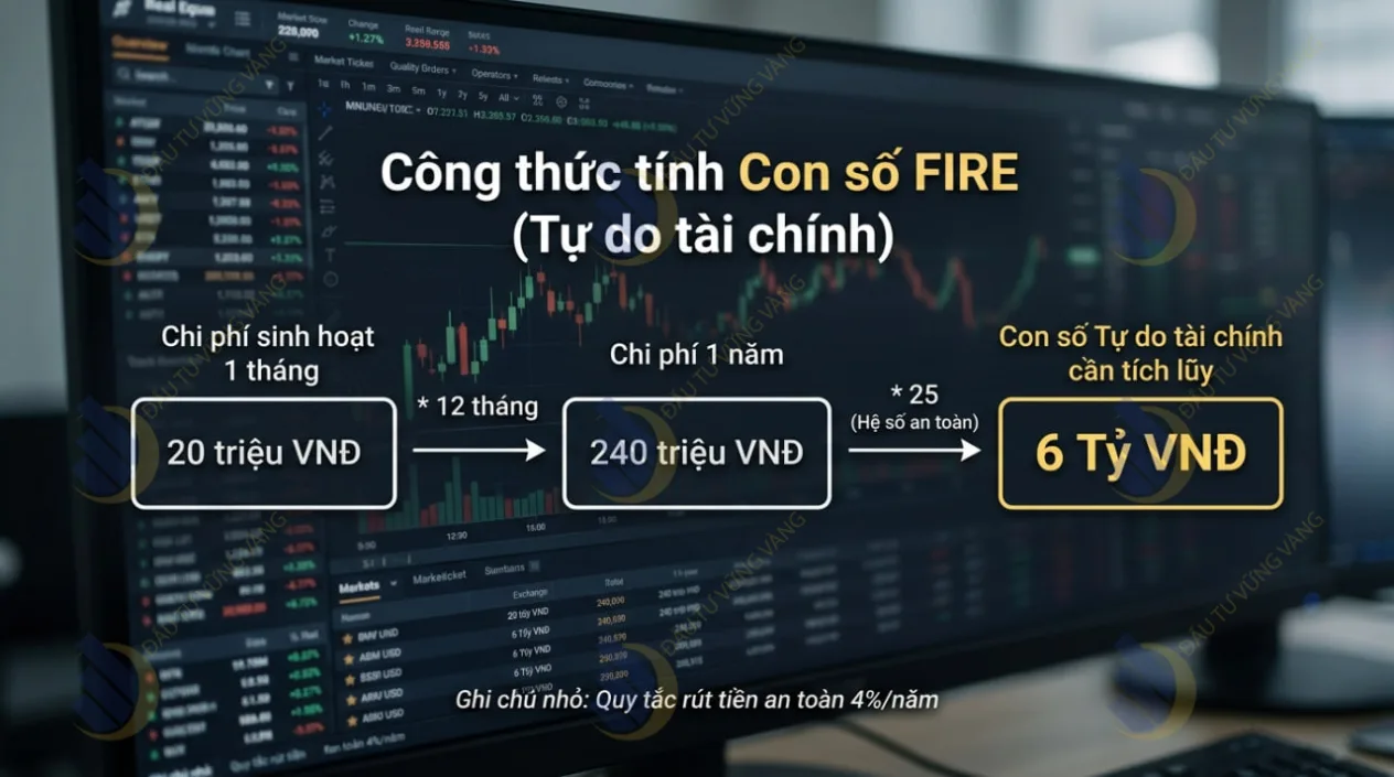 - Con số Tự do tài chính cần đạt: 240 triệu x 25 = 6 Tỷ VNĐ.